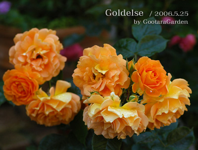 MY ROSESゴルデルゼ![]() Goldelseー(FL) 四季咲き 香り:中香 樹高:約50cm(2006.5) 購入:2003年11月(大苗/京成バラ園) このバラは文句なくお勧めできるフロリバンダ。耐病性に優れ、花つきも文句なく、四季咲性も強く、さらに銅葉から濃緑色に展開する照り葉もとてもきれいです。 花は8cmくらいで房咲き。オレンジ色から黄色、クリーム色へと退色します。花もちもいい! コンパクトに鉢で育てられますし、シュートもバンバンあがります。 花つきがいい分、肥料切れにはご注意。 |