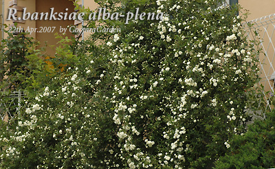 MY ROSESモッコウバラ![]() ![]() R.banksiae alba-plena(sp) 一季咲き 香り:微香 樹高:約300cm(2007.4) 購入:2005年(近所の花や) 2008年5月初、フェンスを破壊しそうな勢いで成長した枝にびっしりと花を付けてくれました。花後にばっさりと選定し、新しい枝を伸ばします。 *********************************** 2代目の白モッコウバラです。 キモッコウのタグのついている苗を買ったのですが白で、2006年初めての開花のときはショックでした〜! 環境があっているのか、我が家の北西フェンスでのびのび育っています。 |